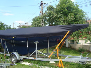 Husa de stationare si transport cu chinga,acopera barca pana la nivelul de sub bordajul ambarcatiuni,chinga impreuna cu cei doi cricheti de strangere permite husei o strangere si o intindere perfecta pe chila ambarcatiuni.