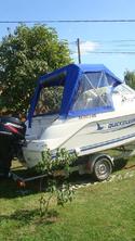 Husa de mars,se poate folosi si ca bimini-top,,parasolar daca se desfac geamurile laterale,care sunt prinse cu fermoare de partea superioara,si cu capse de chila barci.