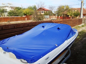 Husa de stationare si transport cu capse si butoni cu blocaj,se fixseaza pe barca cu ajutorul capselor ,butoni se pun in locurile unde exista riscul de desfacere a capselor.Pe marginea husei se face un tiv dublat cu chinga,pt.a evita smulgerea capselor din husa.