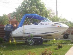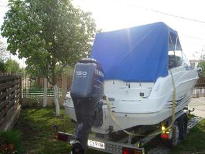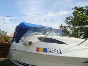 Husa de mars,se poate folosi si ca bimini-top,,parasolar daca se desfac geamurile laterale,care sunt prinse cu fermoare de partea superioara,si cu capse de chila barci.