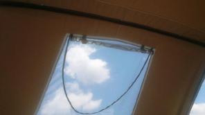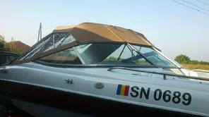 Husa de mars,se poate folosi si ca bimini-top,,parasolar daca se desfac geamurile laterale,care sunt prinse cu fermoare de partea superioara,si cu capse de chila barci.