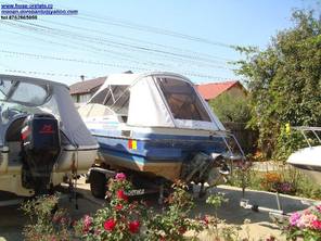 Husa de mars,se poate folosi si ca bimini-top,,parasolar daca se desfac geamurile laterale,care sunt prinse cu fermoare de partea superioara,si cu capse de chila barci.