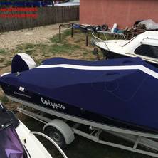 Husa de stationare si transport cu chinga,acopera barca pana la nivelul de sub bordajul ambarcatiuni,chinga impreuna cu cei doi cricheti de strangere permite husei o strangere si o intindere perfecta pe chila ambarcatiuni.