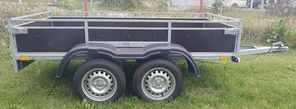 Remorca dublu ax, basculabila, cu oblon fata si spate rabatabil. Toate obloanele sunt detasabile, astfel se poate transforma foarte usor in platforma. Este dotata cu osii Knott, fabricate in Germania. Fiecare osie este de 750 Kg. Cauciucurile sunt pe 13 inchi.