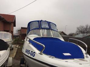 Husa de mars,se poate folosi si ca bimini-top,,parasolar daca se desfac geamurile laterale,care sunt prinse cu fermoare de partea superioara,si cu capse de chila barci.