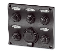 Marine-Shop.ro vinde Panou de comanda 5 butoane cu LED si priza 12V tip bricheta, dimensiune 107 x 96 mm
