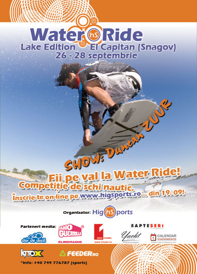HighSports, te invita pe ultimul val al verii, la prima editie WATER RIDE – o competitie de schi nautic, un eveniment ce isi propune sa-ti prelungeasca vara, un cokteil de acrobatii nautice, concursuri, muzica, distractie si multa multa adrenalina. Unde: El Capitan, Snagov. Cand: 26-28 septembrie.