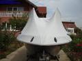 Husa de stationare si transport cu chinga,acopera barca pana la nivelul de sub bordajul ambarcatiuni,chinga impreuna cu cei doi cricheti de strangere permite husei o strangere si o intindere perfecta pe chila ambarcatiuni.